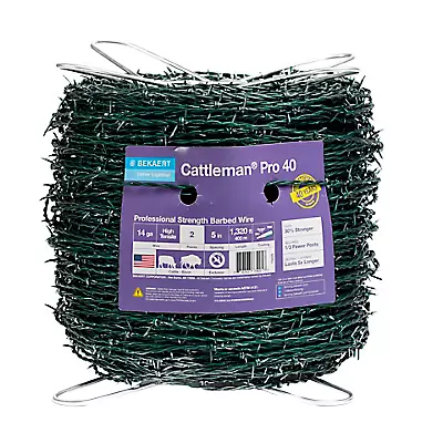 Cattleman® Pro 40 High Tensile Barbed Wire is built to deliver exceptional durability and aesthetics. Featuring 2-point barbs, 14 gauge high tensile wire, and a Bezinal® coating with green paint, this wire offers superior protection for livestock and property with a 40-year guarantee. Perfect for those who want strength and style in their fencing.